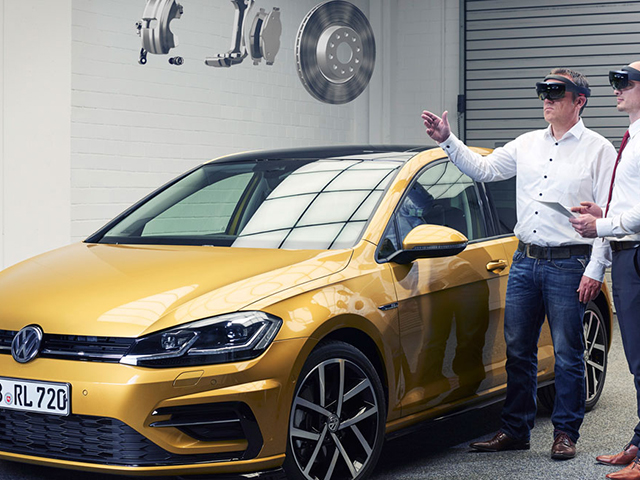 In the center of the room, there is a 1:4 scale model of a Golf. Frank Ostermann inspects the model, and then he changes its wheels, replaces the rear lights and modifies the wing mirrors. Ostermann uses voice commands and gestures to change the design. It is all completed in a matter of seconds. Ostermann is wearing “HoloLens” mixed-reality goggles. The mobile computer developed by Microsoft projects virtual content onto a physical object through gesture control and voice commands: Ostermann only needs to point his finger and the HoloLens projects a different paint color onto the Golf, installs different wheels or modifies the fenders. Initially, the Golf was an R-Line model but it then became an entirely new version.